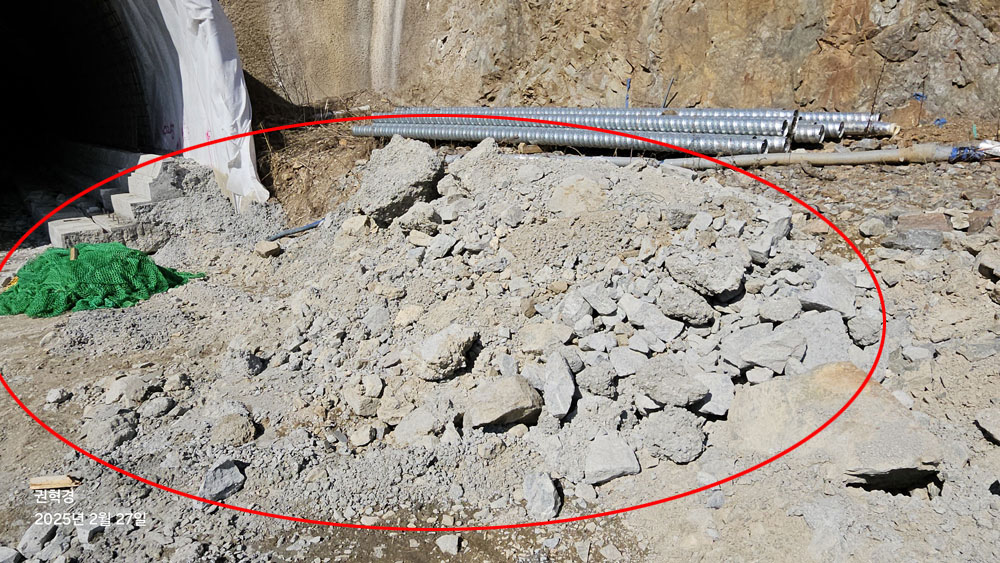 ▲(사진 원안) 어쨌든 지난달 27일 현재, 터널 입구 주변에 폐콘크리트, 숏크리트 등 건설폐기물이 토석에 박혀 노출해 있거나, 상부에 오염 방지 기초시설인 그 흔한 방진 덮개 그물망도 설치하지 않은 채 길게 널려 있는 등 폐기물 관리가 안 되고 있다.