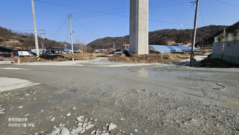 ▲(사진) 또한 다른 곳에 설치한 비산먼지 발생 억제 장치인 자동식 세륜시설을 운용하지 않은 채 옆으로 암석 운송 덤프트럭이 드나들면서 흙탕물과 차량 바퀴 자국으로 훼손됐으며, 굴다리를 통과하는 일반 차량은 흙탕물이 튈까 봐 노심초사 운행하고 있다.