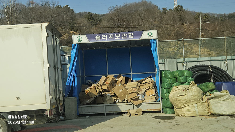 ▲(사진 원안) 이와 함께 세륜슬러지를 주변 토양 위에 펼친 흔적이 역력한 가운데 슬러지 보관함에는 전혀 성상이 다른 폐기물인 종이박스로 가득 차 있다.